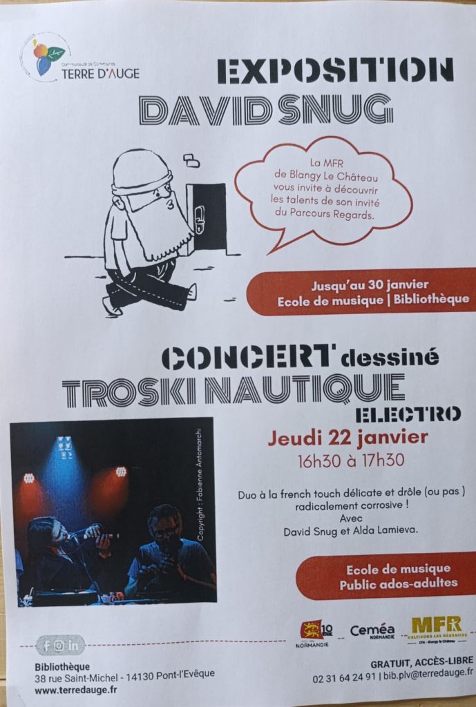 Le parcours Regard de David Snug s’achève …avec un concert dessiné à l’Ecole de musique de Pont-l’Évêque, ce jeudi 22 janvier . Bonne humeur, auto- dérision, et musique électronique ont été partagés par le groupe Trotski Nautique avec les jeunes de Capa 2.
